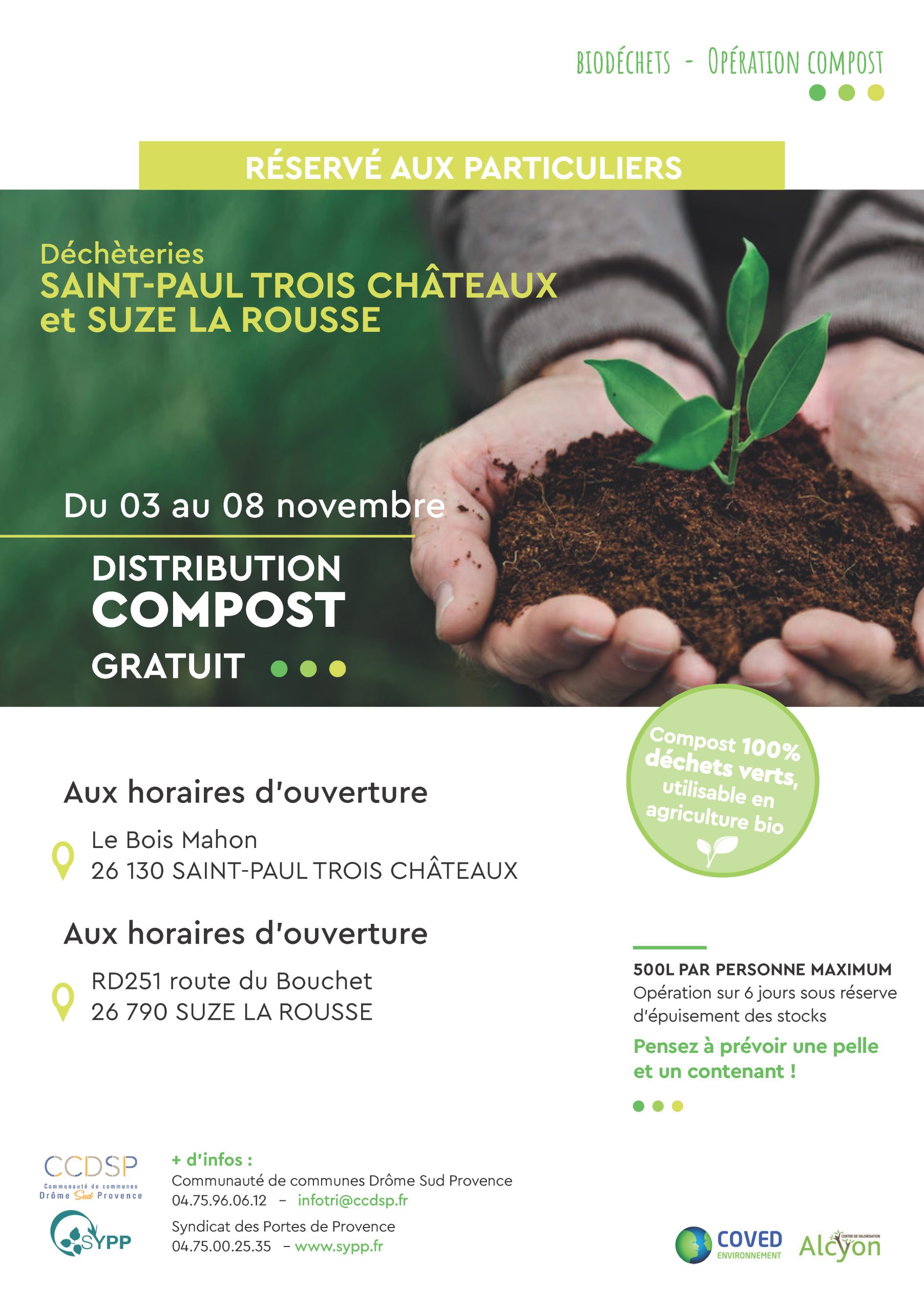Du 3 au 8 novembre – Distribution de compost à la déchetterie Voir l'image agrandie Informations : 04 75 00 25 35 ou 04 75 96 06 12 suze2025-10-29T11:48:55+01:00octobre 29th 2025| Articles similaires Rappel – Obligation de déclaration des locations touristiques Galerie Rappel – Obligation de déclaration des locations touristiques Fermeture des déchetteries le mardi 11 novembre 2025 Galerie Fermeture des déchetteries le mardi 11 novembre 2025 CONTACT ENEDIS – En cas de coupure d’électricité Galerie CONTACT ENEDIS – En cas de coupure d’électricité Mardi 11 novembre – Banquet proposé par l’association des Anciens combattants Galerie Mardi 11 novembre – Banquet proposé par l’association des Anciens combattants Mercredi 12 novembre – FORUM DES OPERATEURS FIBRE OPTIQUE Galerie Mercredi 12 novembre – FORUM DES OPERATEURS FIBRE OPTIQUE